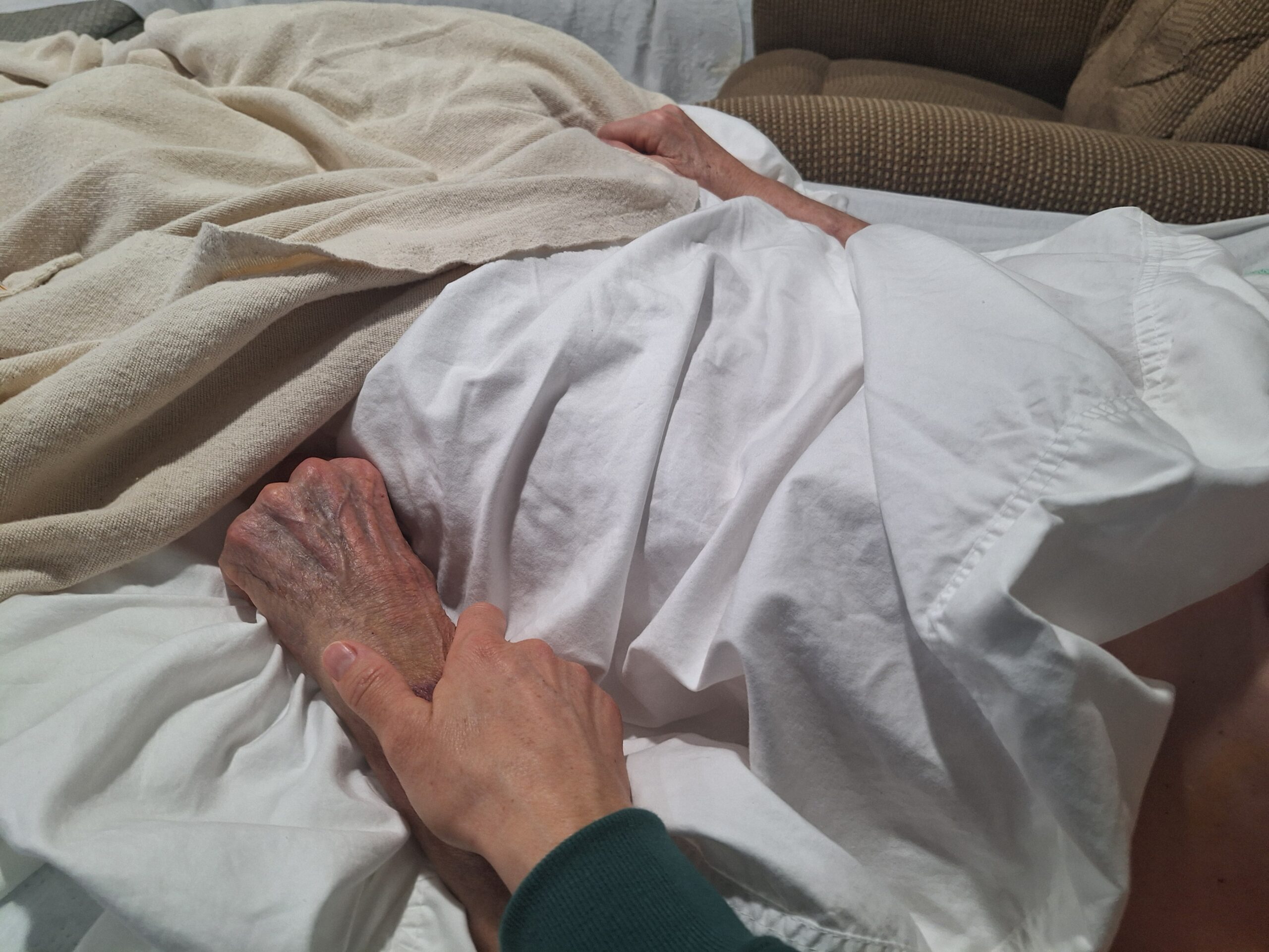 I took over the singing. Mom and I sat on either side of him, and as we each held his hands and stroked his arms, I tearfully cried the words,