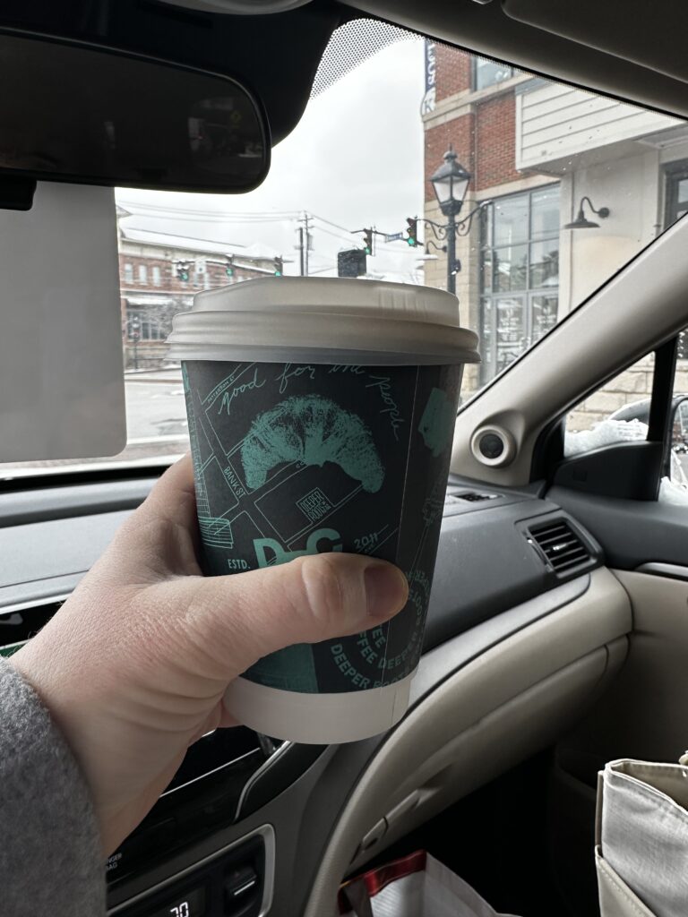 That same morning, when we woke up, the café in my small hometown was unable to make coffee – a water boil advisory brought on by frozen pipes was to blame. Of all days, this was not one to be attempted without coffee. I text my friend, Lauren, in desperation, thirty seconds before she offered, and she was on her way with a latte from my favorite coffee shop in Cincinnati.